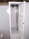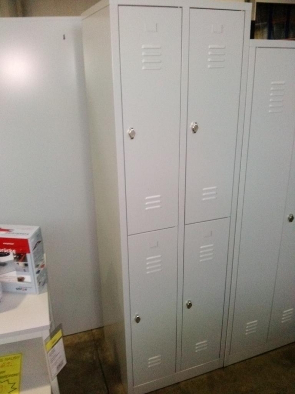Garderobenschrank mit Doppelabteil,insgesamt 4 Türen, auf Sockel Hochwertige pulverbeschichtete Stahlausführung in lichtgrau, Drehriegelverschluss für eigenes Vorhängeschloss.