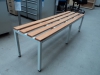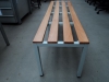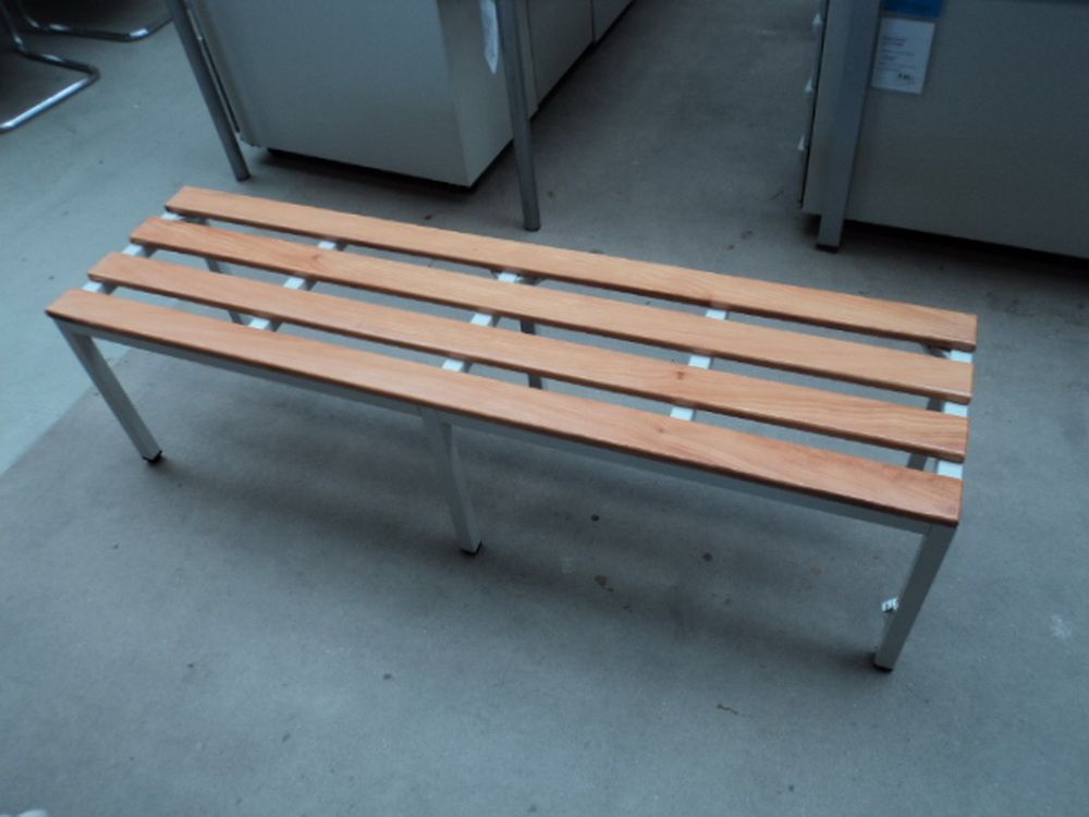 Die freistehende Sitzbank deren Sitzfläche aus allseitig gehobelten 4 Buche - Natur - Holzleisten besteht, ist klarlackiert und mit naturgegebenen Farbunterschieden.